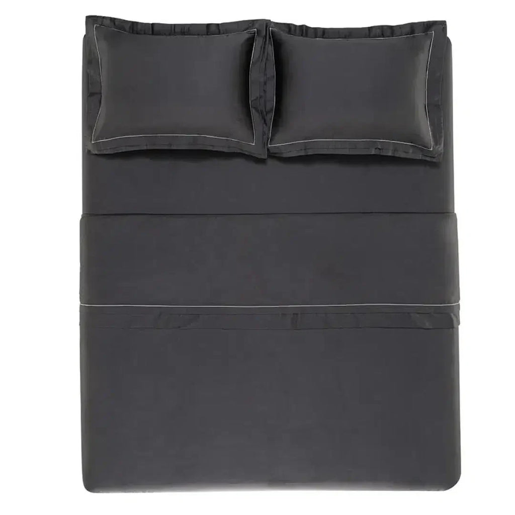 Acabamento: Tecido sanforizado e mercerizado; Fronha 4 abas duplas com ponto royal; Dobra feita com aba dupla e ponto royal; Lençol com elástico