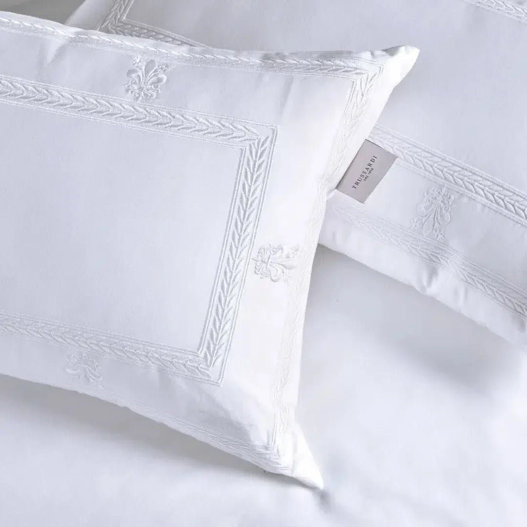 O Jogo de Cama Queen Florim com 4 Peças Branco da Trussardi, inspirado no clássico bordado Florim é uma homenagem à rica herança cultural de Florença, traduzindo a majestade da flor-de-lis, símbolo de poder e soberania, presente no brasão e nas moedas da época. Confeccionado em cetim 300 fios 100% Algodão Egípcion, este jogo de cama exala sofisticação e imponência, capturando o espírito nobre dos fiorentinos e unindo história e estilo de maneira única, ideal para quem busca elegância e um toque de tradição em seu lar.