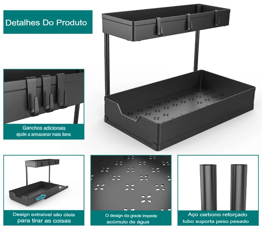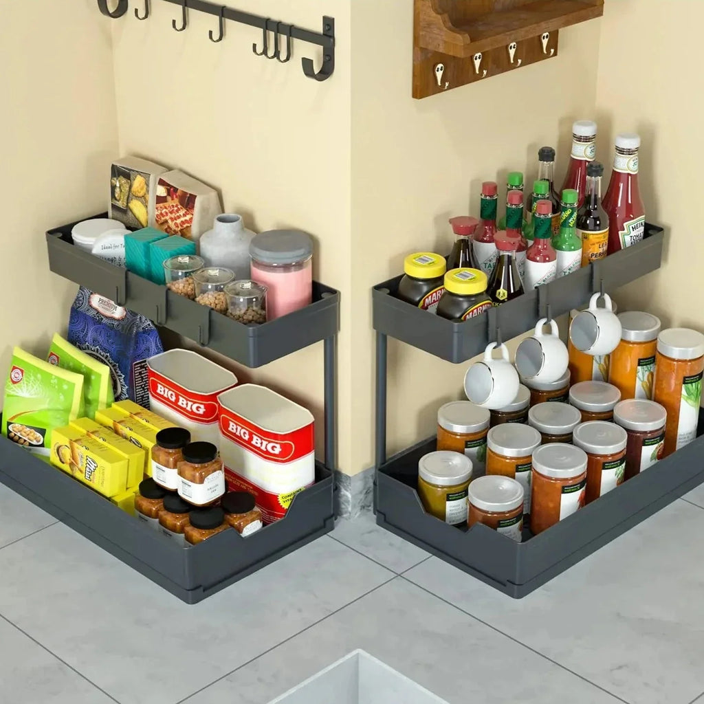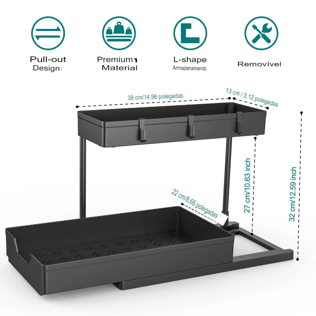 Aproveite ao máximo o espaço embaixo da pia com a Prateleira Organizadora Deslizante de 2 Níveis em L! Esta prateleira inovadora é perfeita para organizar seus utensílios de cozinha, produtos de limpeza e muito mais.